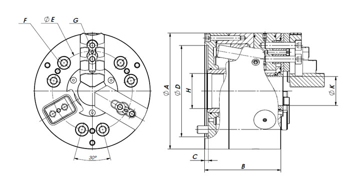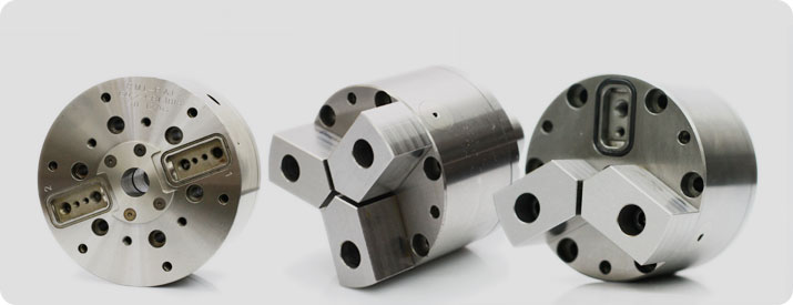 1. Round jaws air chuck comes with integrated air piston. The chuck is hermetically sealed, stronger, and 30% faster than standard T slot one. Chuck size ranges from 64MM up to 170MM. Speed range from 4500 rpm for a large size to over 10,000 rpm for the smallest chuck size.